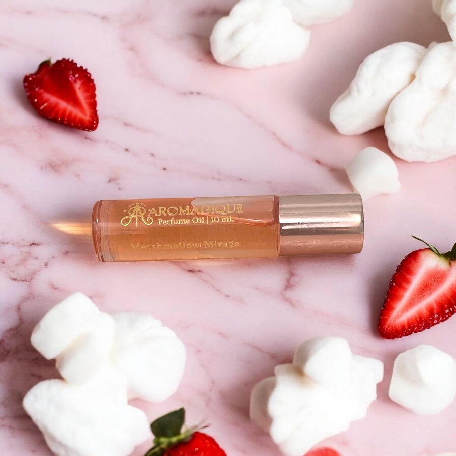 Marshmallow Mirage by Aromagique — A radiant burst of citrus and blossom melts into fluffy marshmallow, strawberry, and coconut, settling into a cloud of vanilla, whipped cream, and musk. Sweet. Dreamy. Irresistible.
